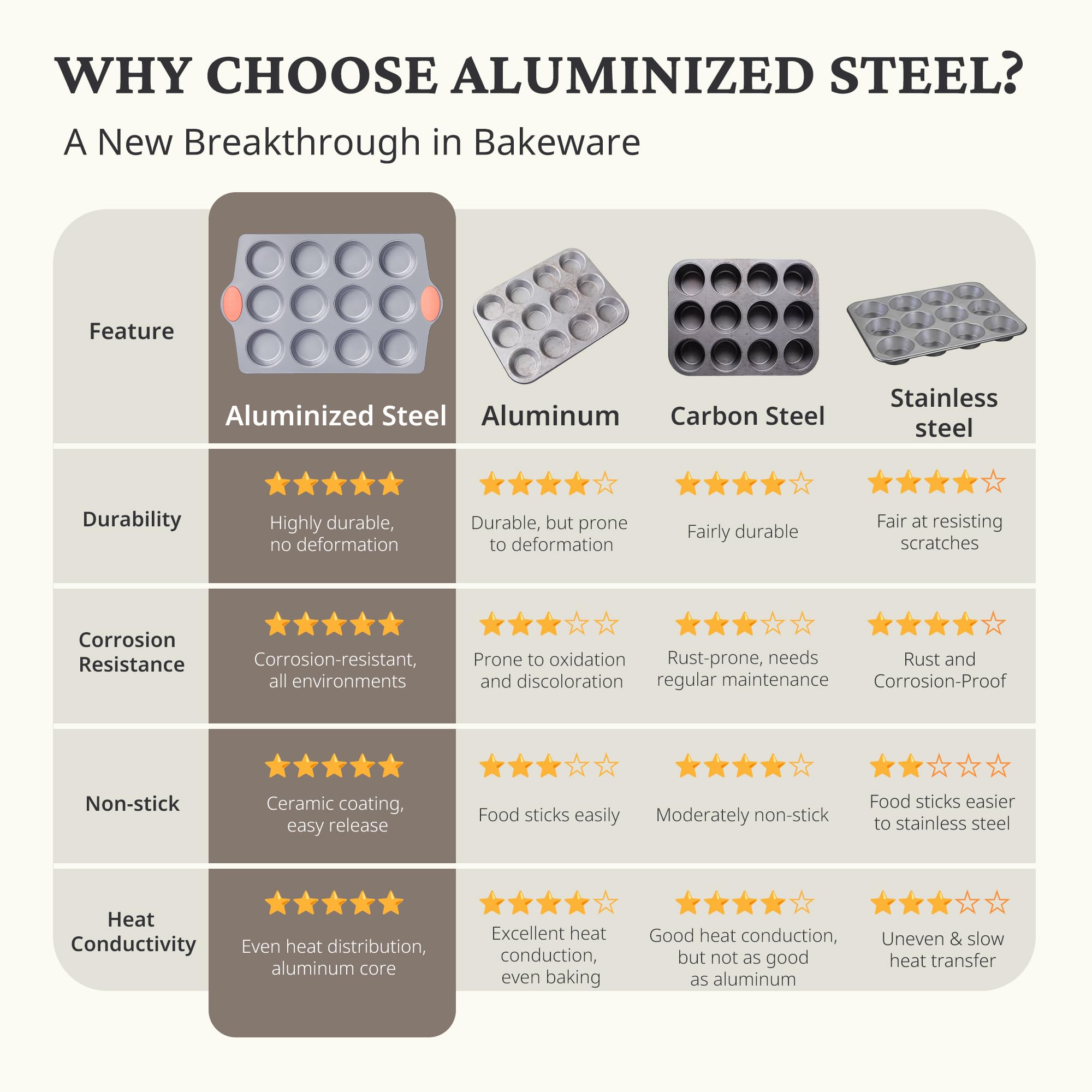 Crafted from high-quality aluminized steel, a new and advanced material offering 50% better corrosion resistance and durability compared to traditional pans. This innovative material provides even heat distribution, significantly reducing baking time and withstanding temperatures up to 500°F. Ideal for ovens, dishwashers, and refrigerators, this muffin pan is designed to enhance convenience in every kitchen.