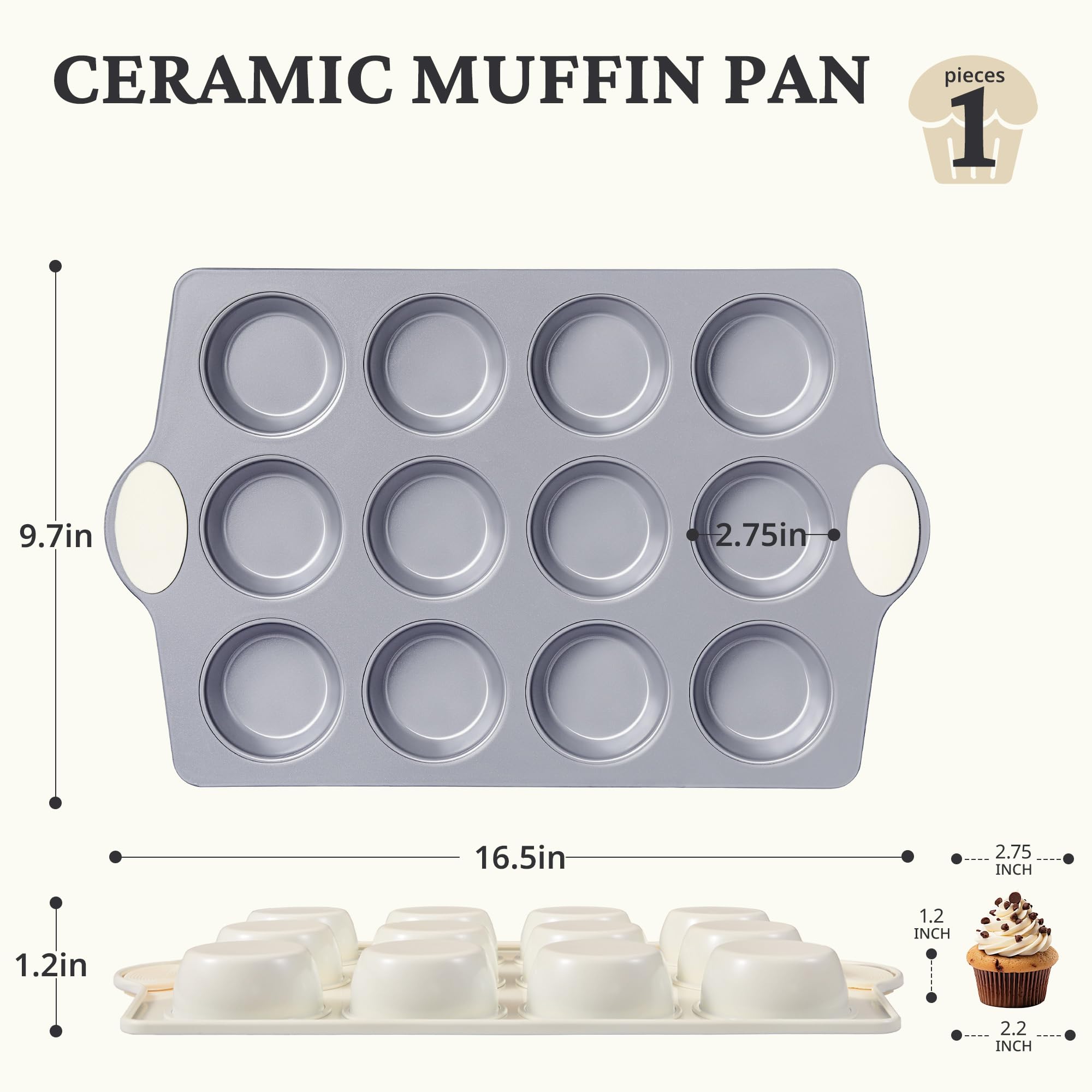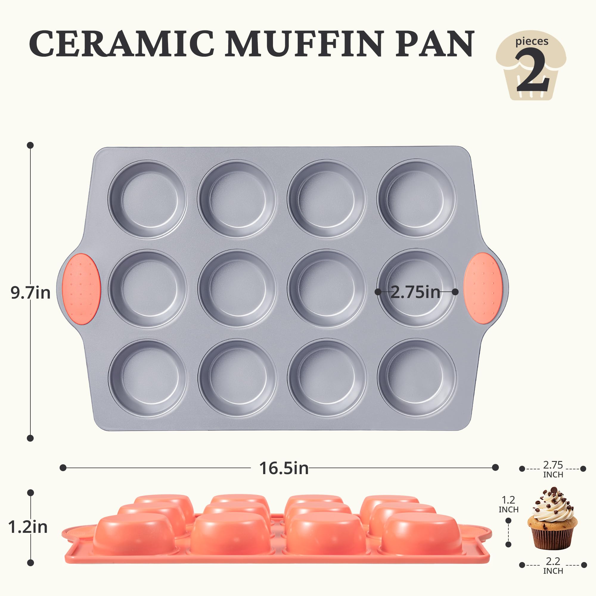 Measuring 16.5 × 9.7 × 1.18 inches, this 12-cup muffin pan provides ample space for baking. Features heat-resistant, detachable silicone handles for a comfortable grip and the ability to withstand high temperatures for added safety and convenience. To preserve the ceramic coating's longevity, we recommend washing with mild detergent and a soft sponge.