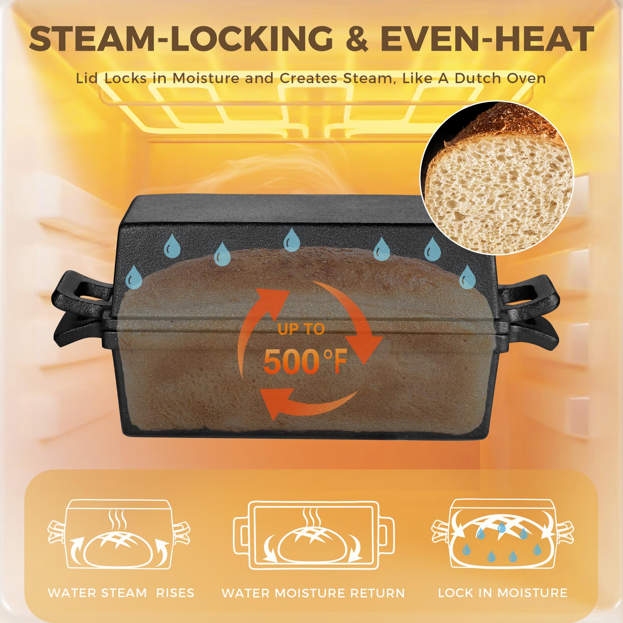 Able to withstand up to 500°F, the bread loaf pan ensures even heat distribution for perfectly baked bread. When the lid is used, it mimics a Dutch oven by trapping steam inside, creating a moist environment that allows heat to circulate evenly. The result is a golden, crispy crust and a soft, fluffy interior—no steam mode required in your oven.