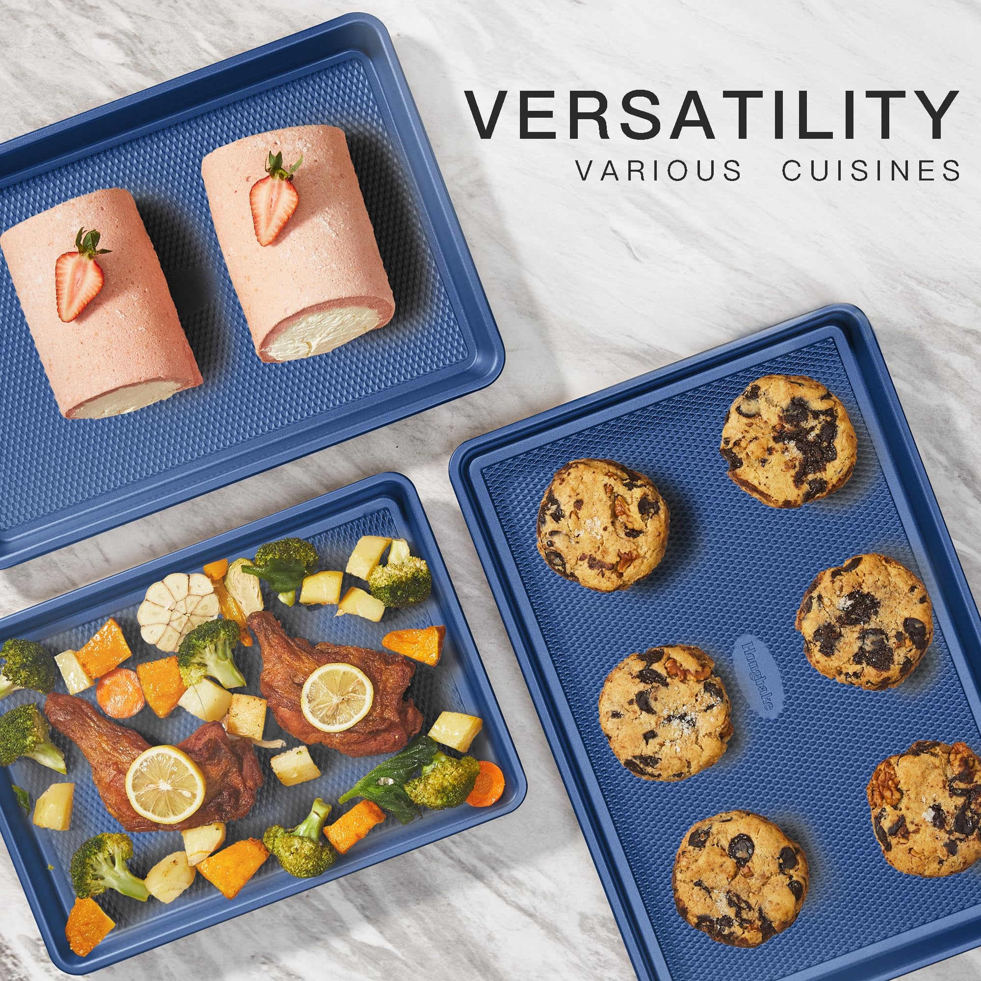 This baking pan set includes 3 non-stick cookie sheets: quarter (13" × 9"), jelly roll (15" × 10"), and half sheet (17.5" × 12"). They are just the right sizes—small for baking cookies, pastry, and lasagna, medium size for baking jelly rolls, large size for baking chicken and vegetables, etc. Just one set can easily satisfy your daily baking needs and help you take your baking to the next level.
