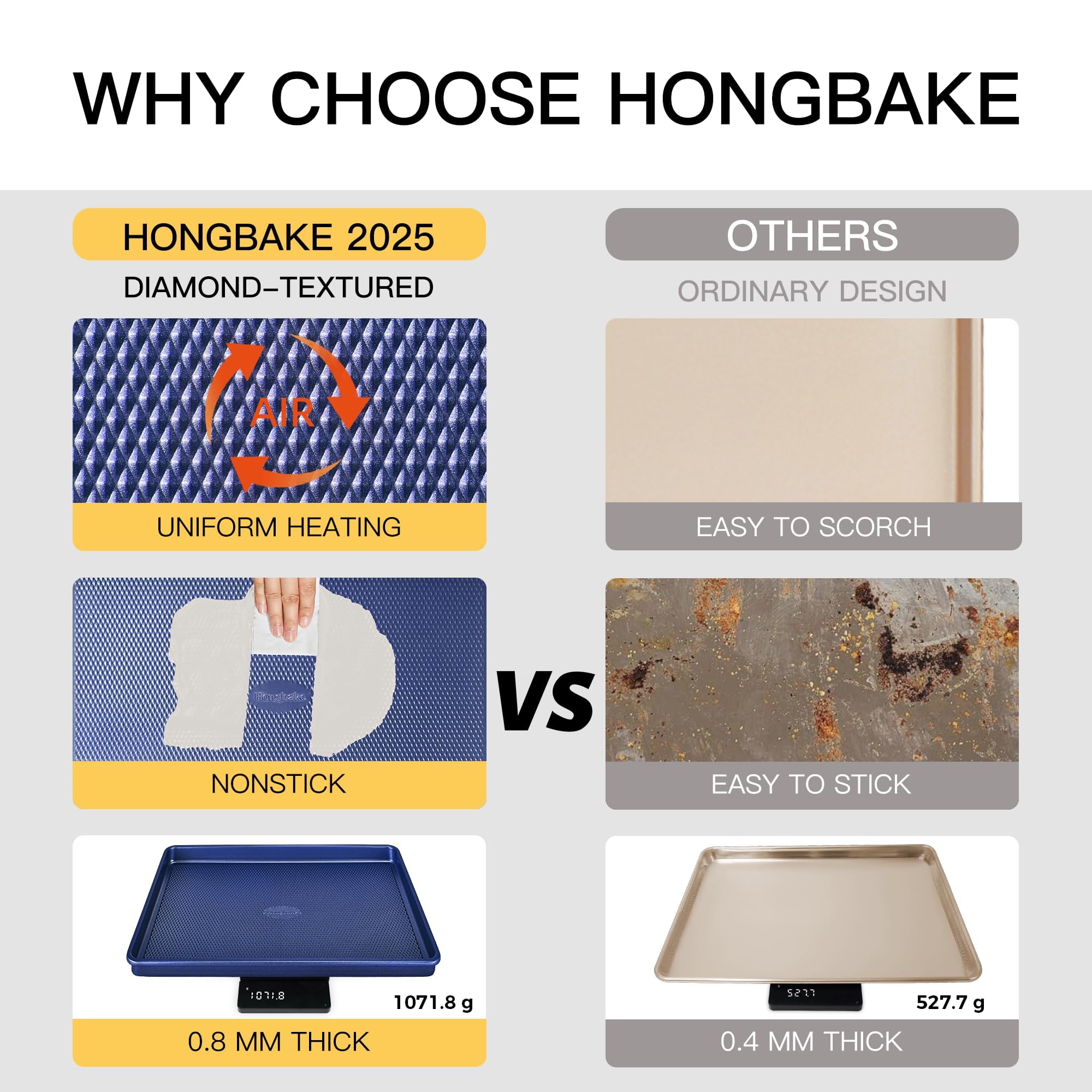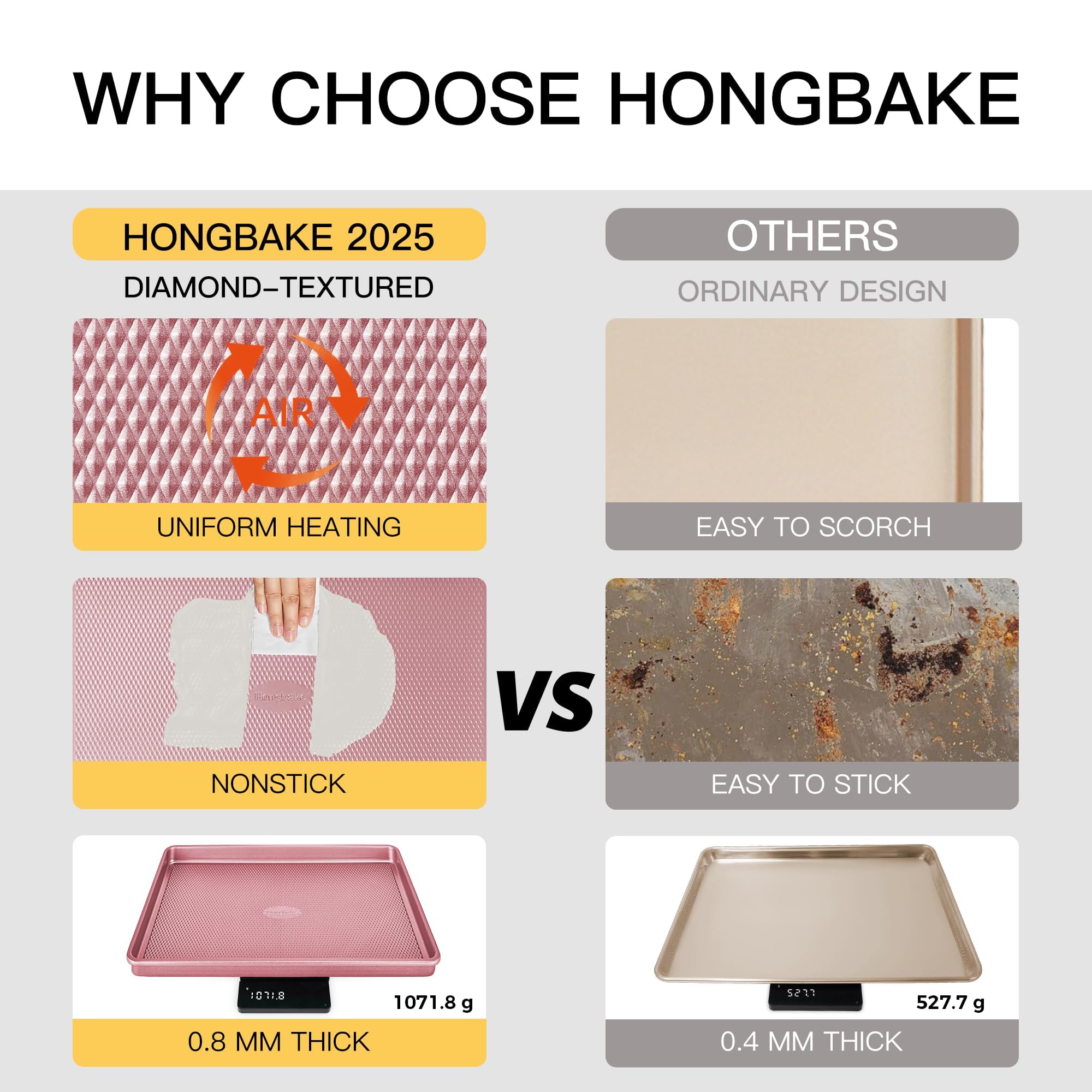 The cookie sheet pan set features a diamond texture on the base that increases its non-stick properties and ensures even and quick heat airflow to your food, which makes cookies consistently baked without any over or undercooked parts. This innovative design delivers perfect results every time.