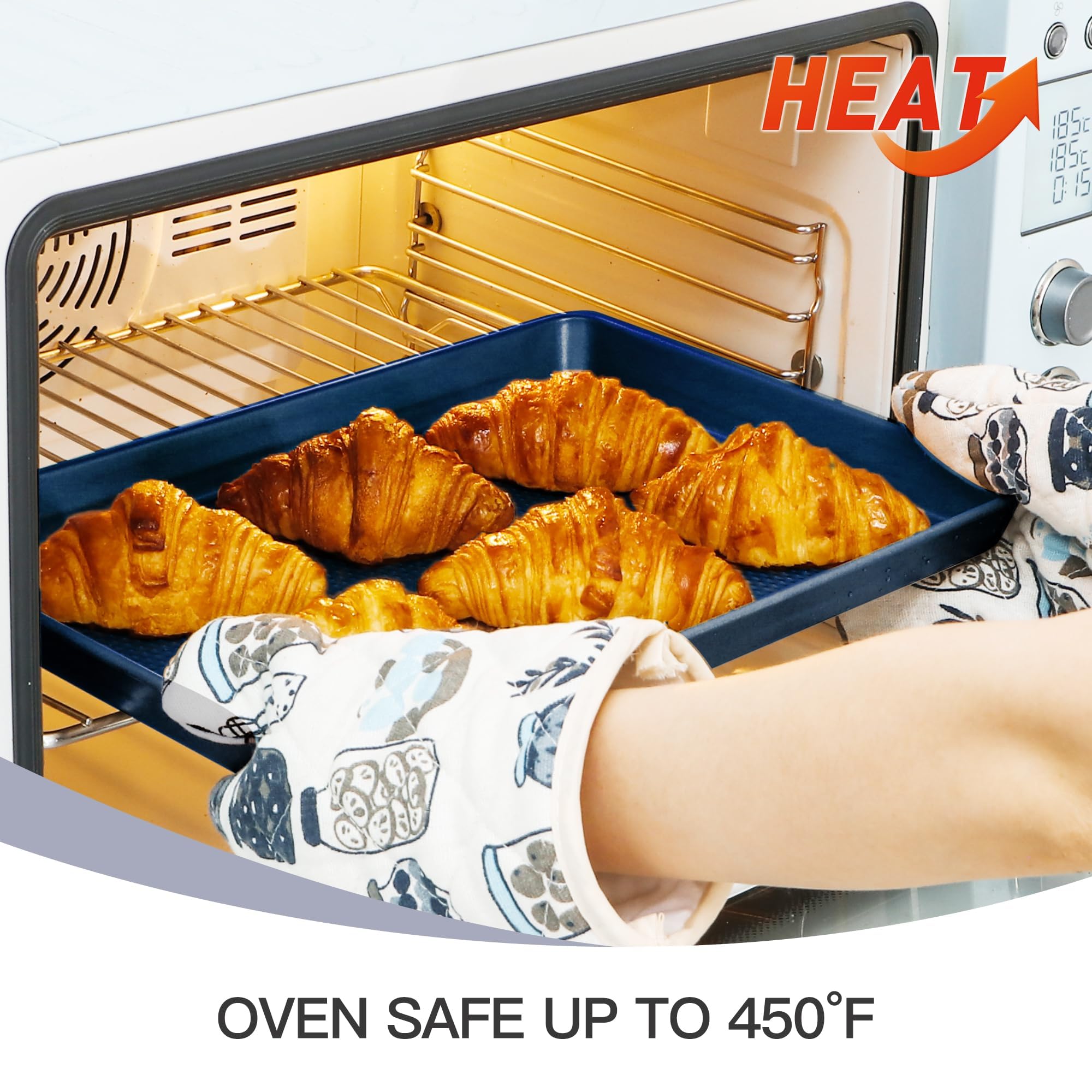 With 57% thicker carbon steel, these durable oven trays are constructed from heavy-gauge carbon steel for stability, even heat distribution, and durability for years to come. Warranty against peeling off with heat-resistance temperature up to 450°F.