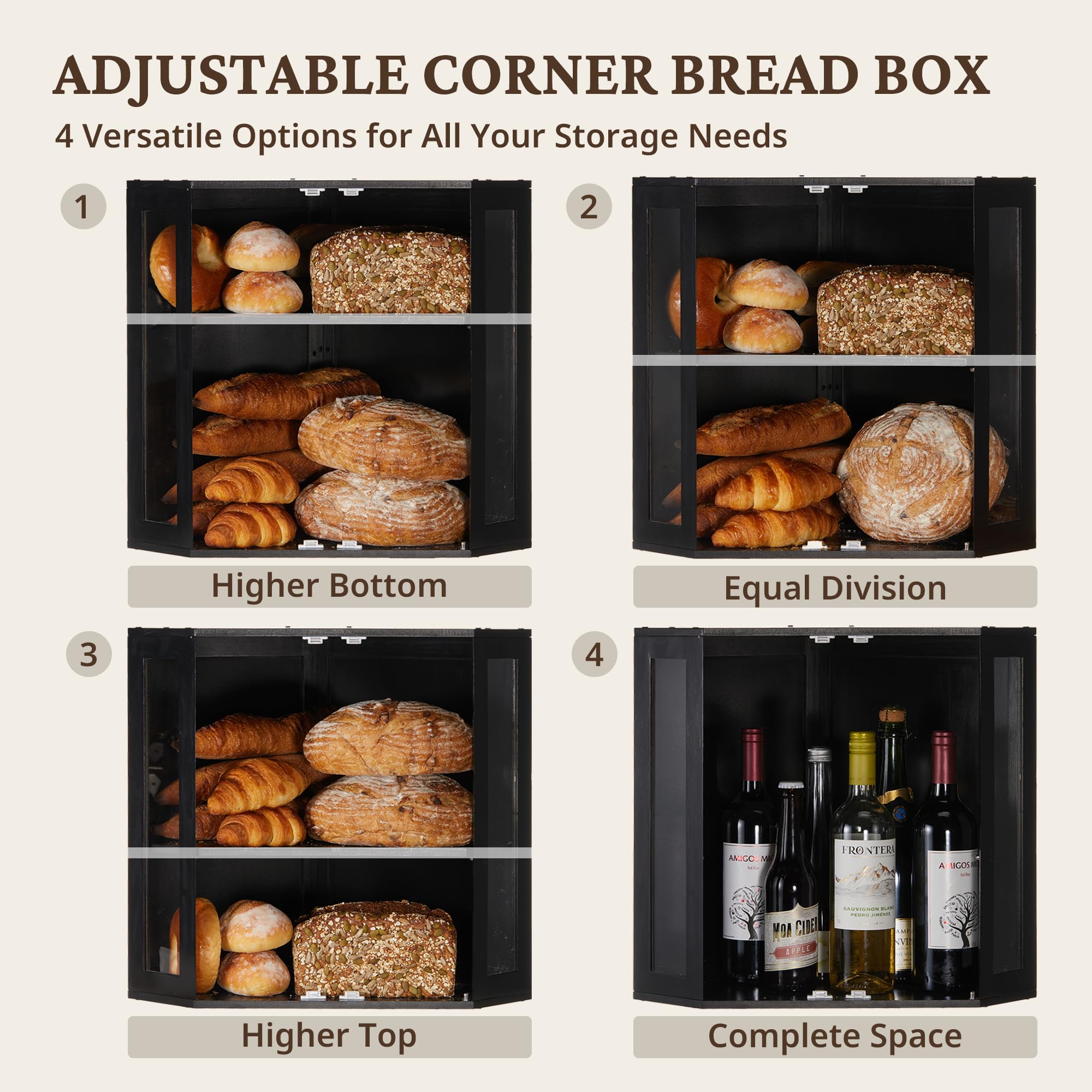 Measuring 12.6" × 12.6" × 16.5", this corner breadbox offers a spacious dual-layer storage solution with removable, adjustable dividers. The three-level height adjustment ensures you can tailor the storage space to fit a variety of baked goods.