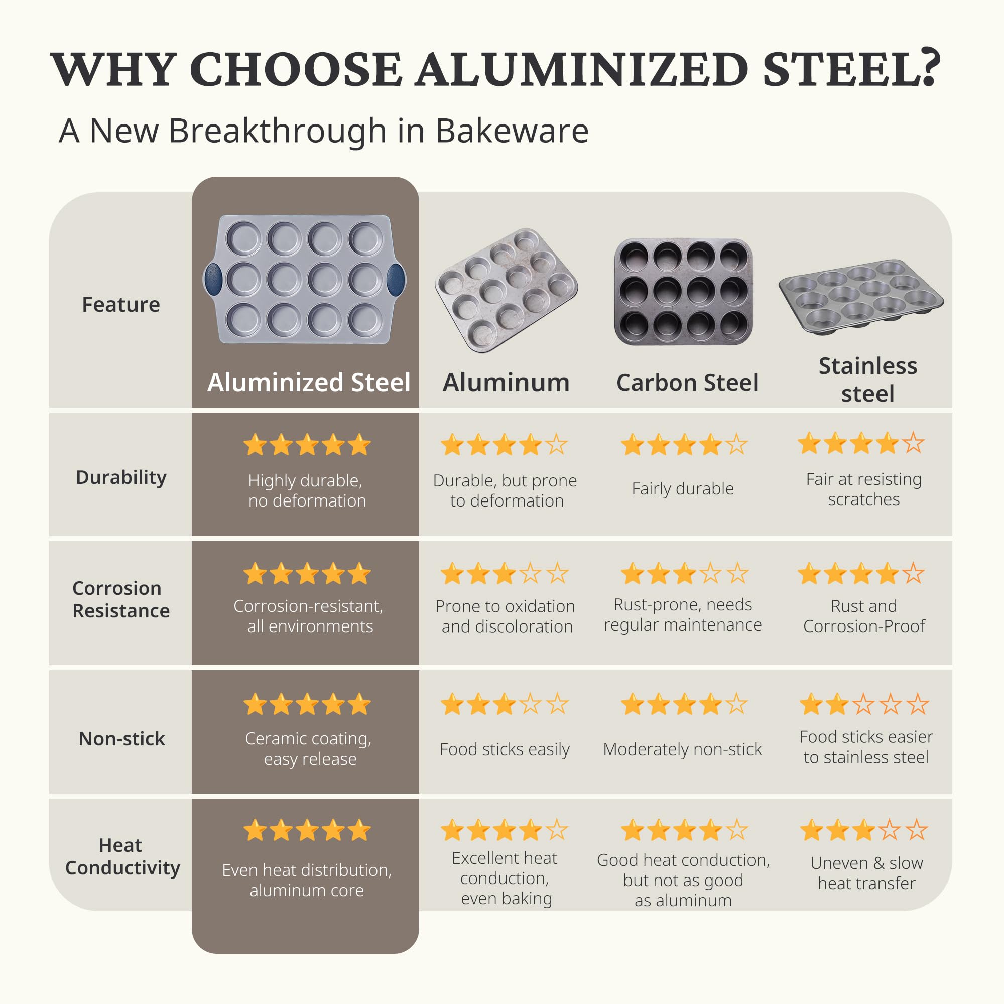 Made from highly durable aluminized steel, offering 50% better corrosion resistance and durability compared to traditional muffin pans. The even heat distribution significantly shortens baking time and can withstand temperatures up to 500°F. Suitable for use in ovens, dishwashers, refrigerators, and freezers, greatly enhancing convenience in your kitchen.