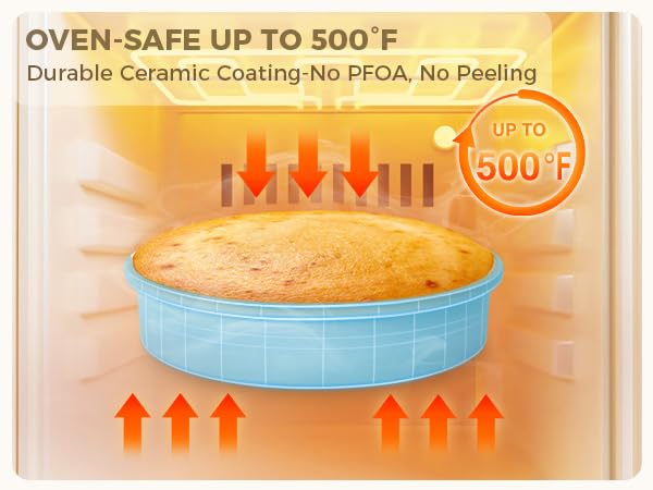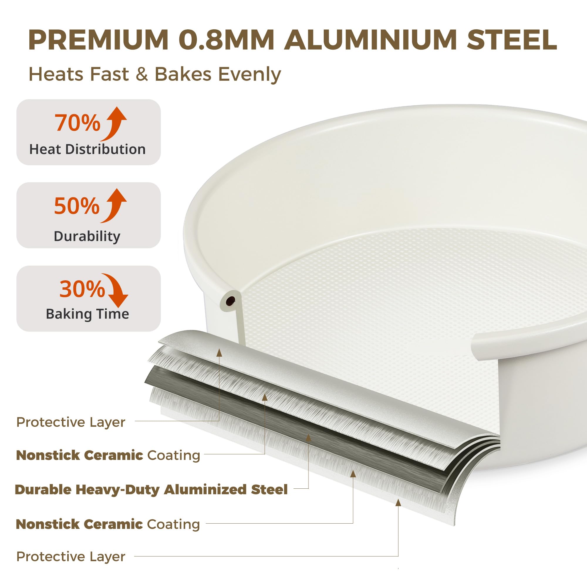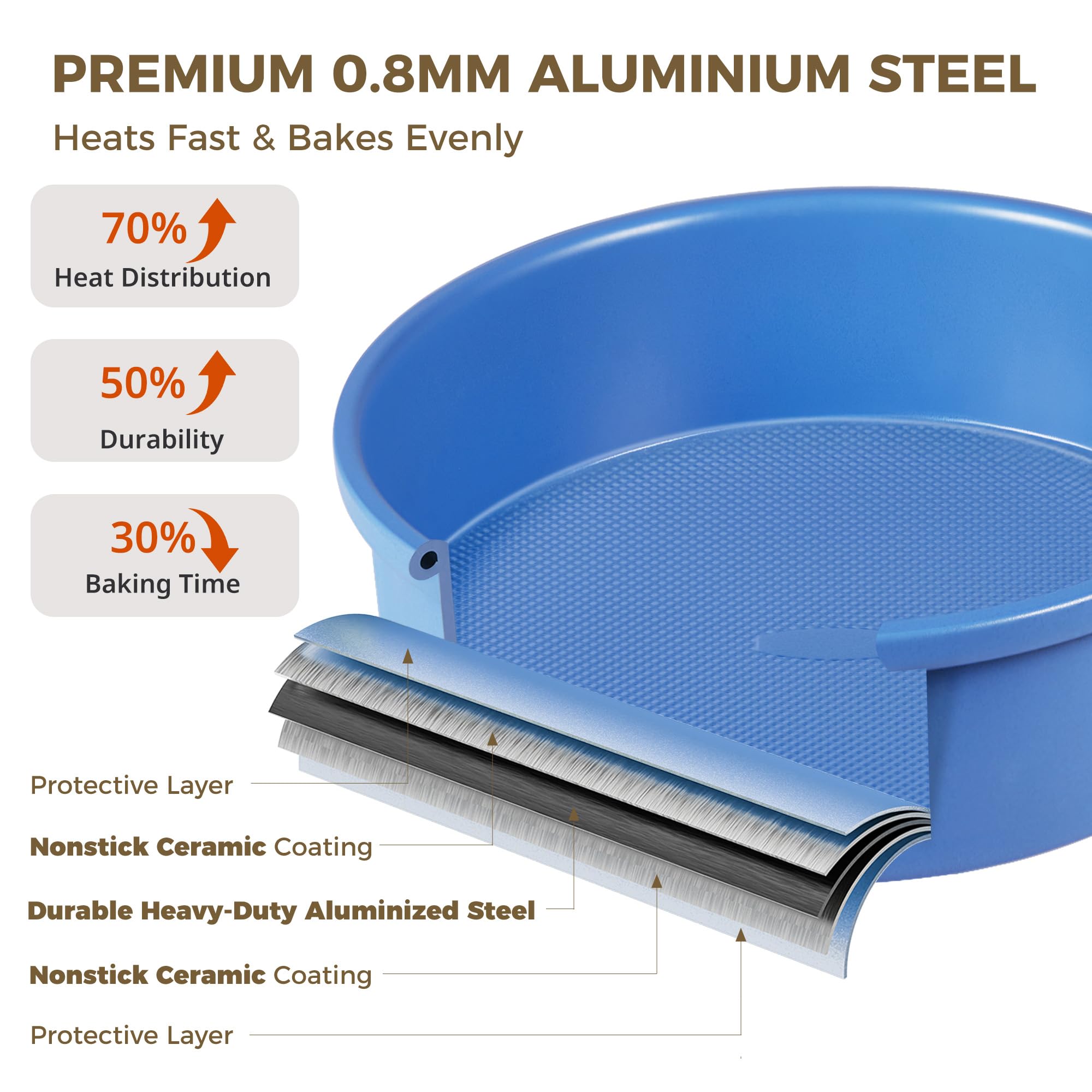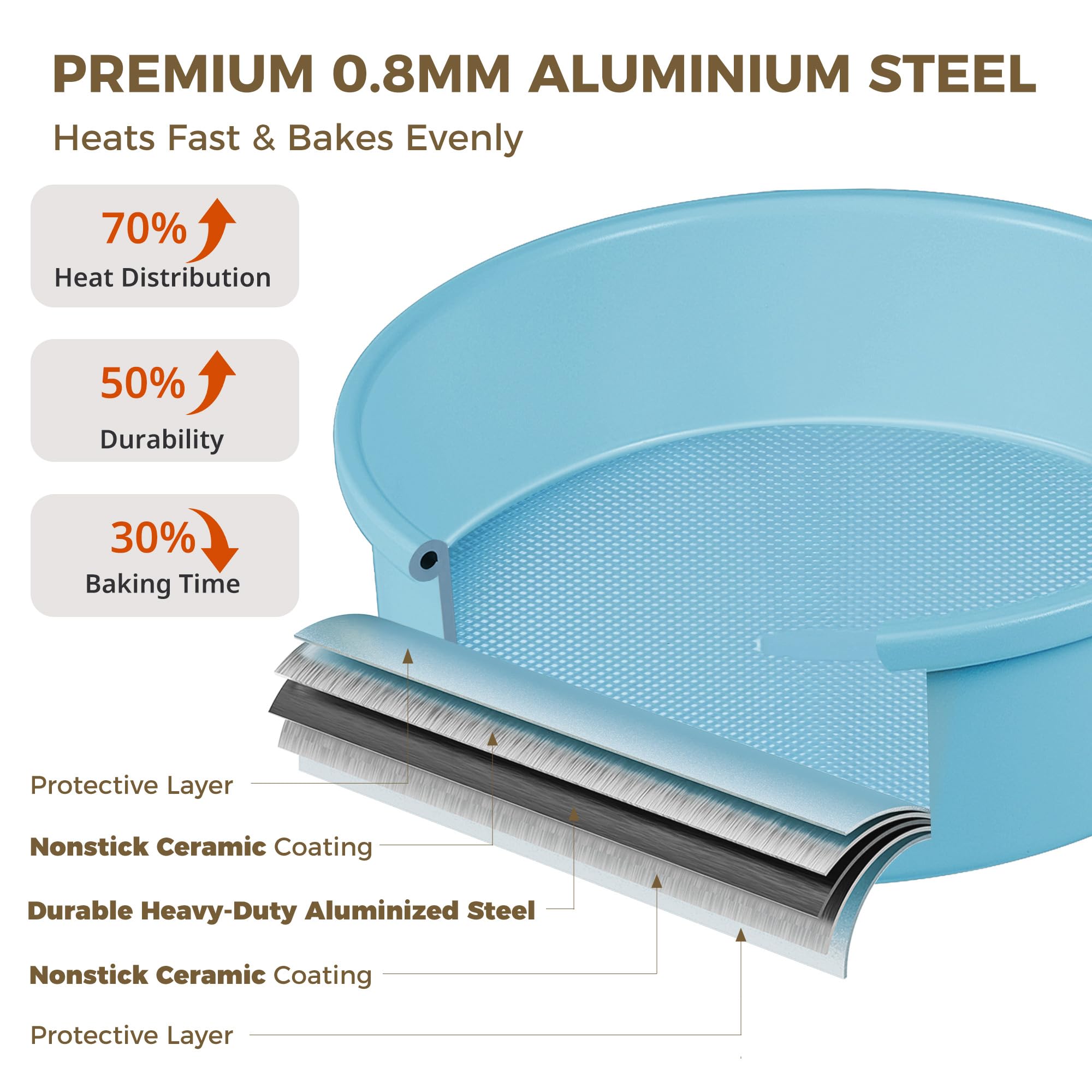 Made with 0.8mm heavy-duty aluminized steel, these round cake pans heat up quickly and evenly without warping. They conduct heat faster than standard pans, reducing baking time by 3–5 minutes. Oven-safe up to 500°F, they deliver stable, reliable results every time.