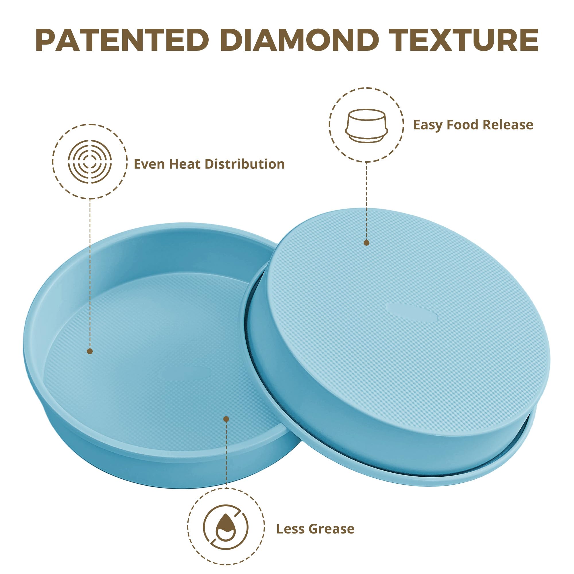 Upgrade your baking with our premium cake pans, featuring a unique diamond texture. This design ensures even heating and minimizes moisture build-up, resulting in perfectly golden-brown cakes. The raised pattern reduces food contact, giving you a crispier texture with less oil, and the non-stick diamond surface allows for easy food release. With its elegant appearance and high durability, this 9 inch round cake pan is a must-have kitchen essential.