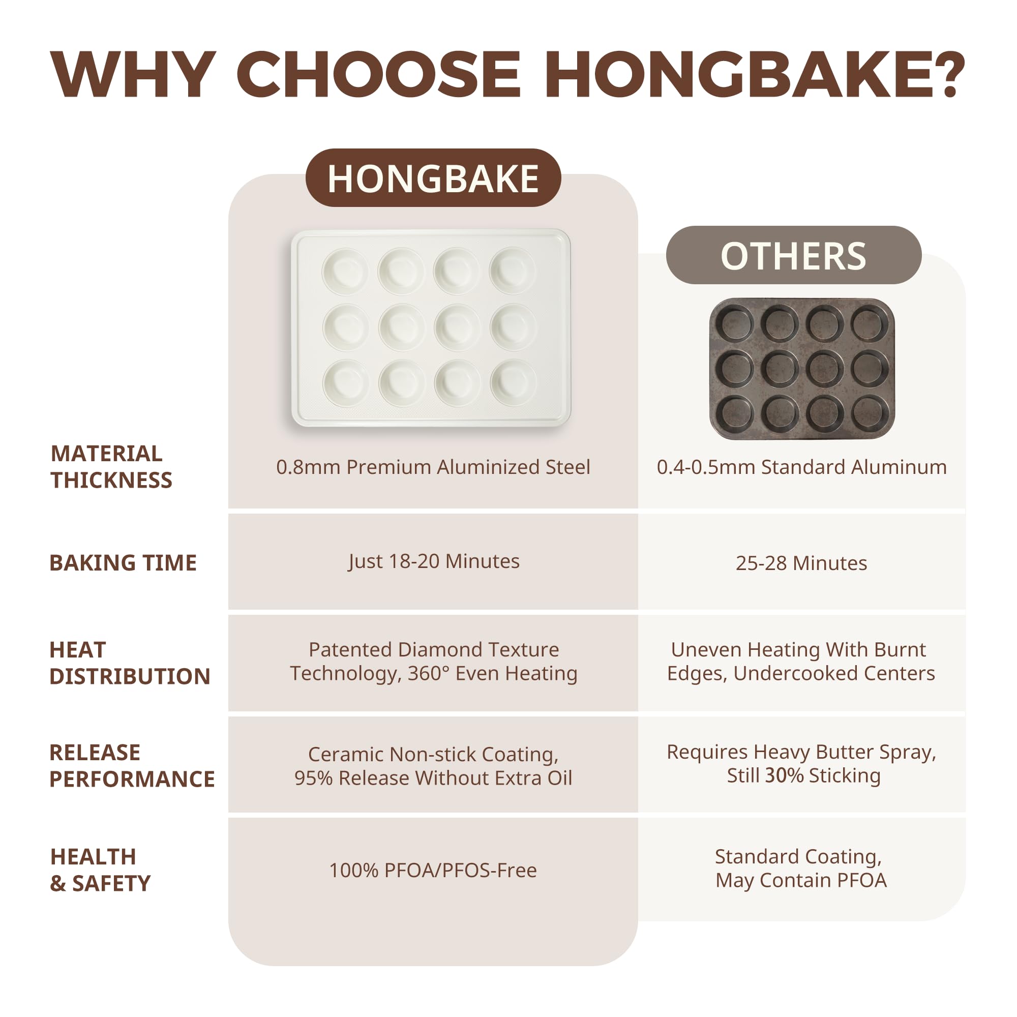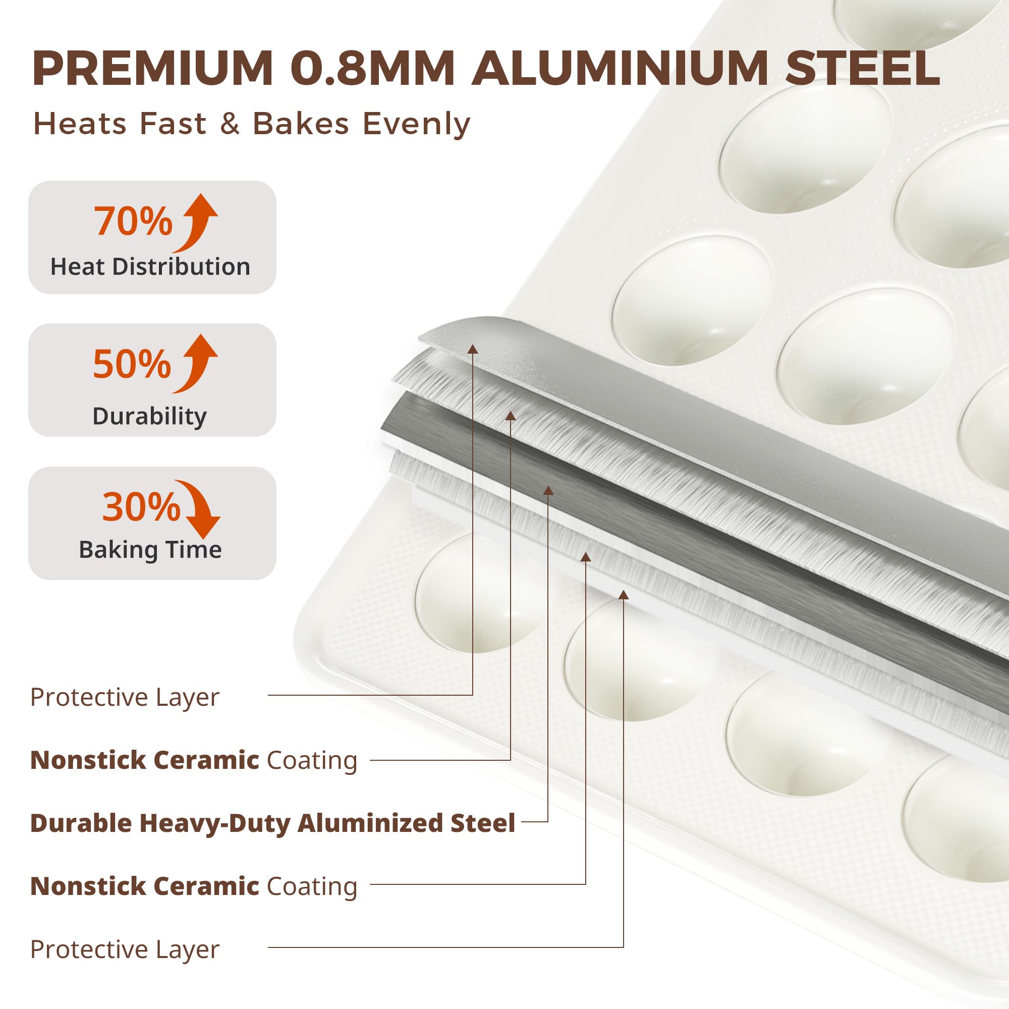Our 0.8mm thick muffin pan is made from heavy-duty, thickened aluminized steel, which ensures rapid heat conduction and distribution. This material provides stability, even heating, and durability. It can withstand temperatures up to 500°F without peeling, guaranteeing perfect baking results every time.