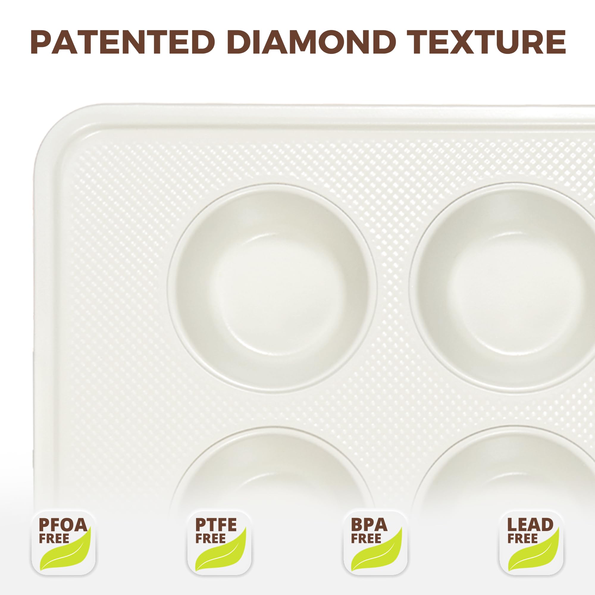 Our premium nonstick muffin pan features a diamond-textured bottom that promotes even heat flow for better baking and faster cooling. The raised pattern also helps prevent scratches from oven racks and countertops, keeping your pan looking new longer.
