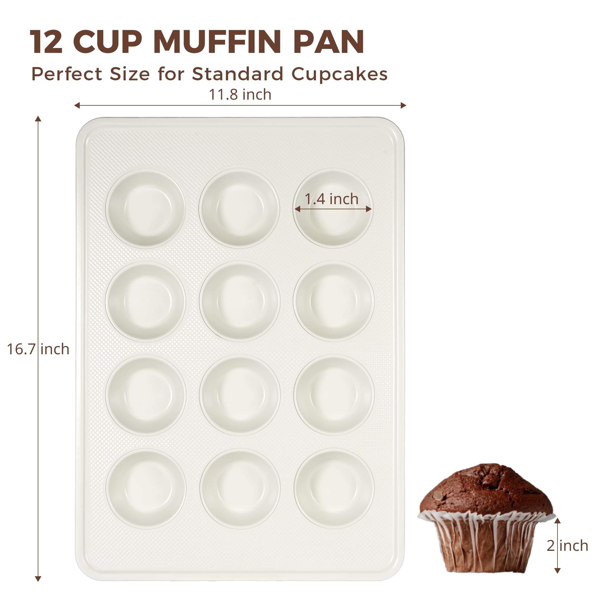 Our 0.8mm thick ceramic muffin pan 12 is made from heavy-duty, thickened aluminized steel, which ensures rapid heat conduction and distribution. This material provides stability, even heating, and durability. It can withstand temperatures up to 500°F without peeling, guaranteeing perfect baking results every time.