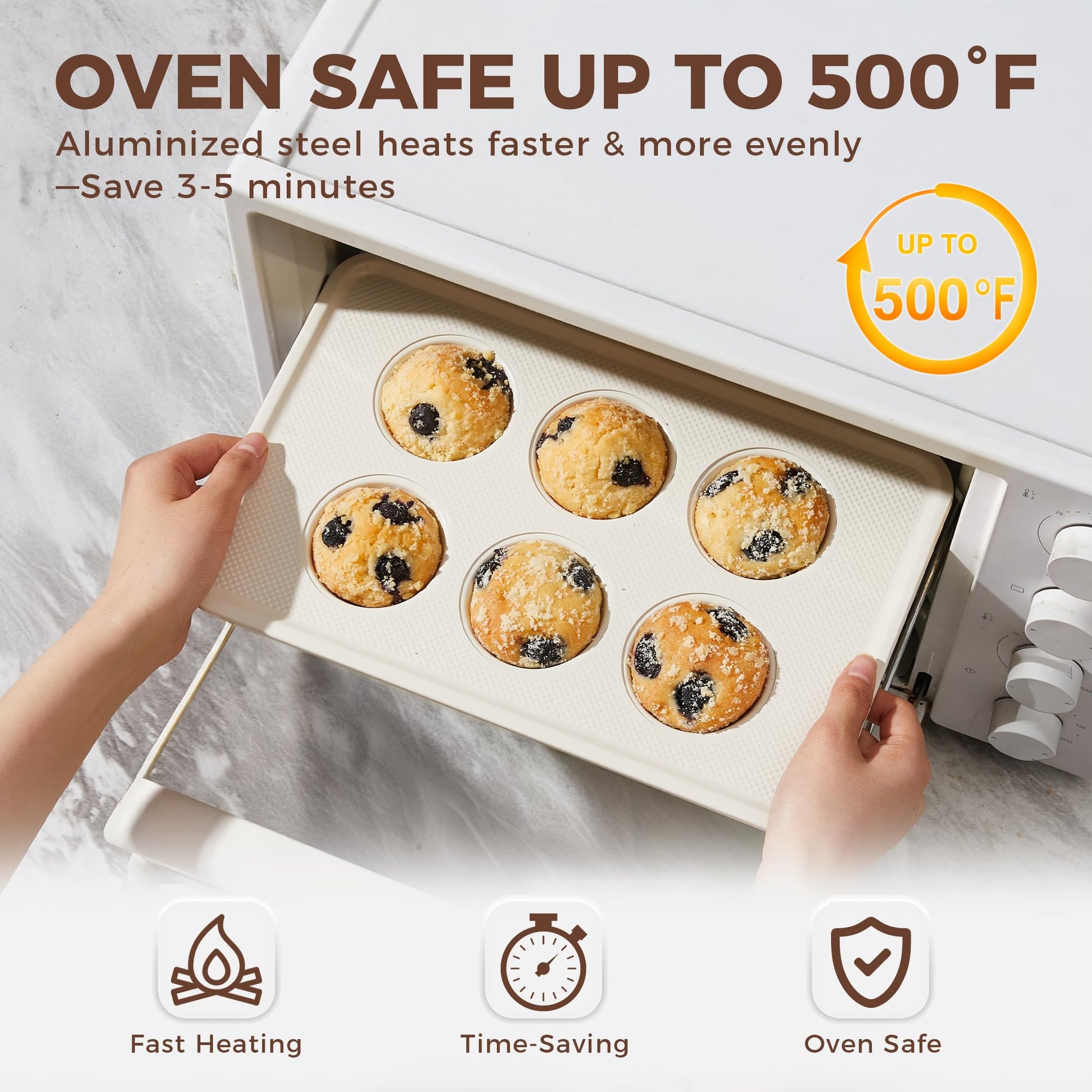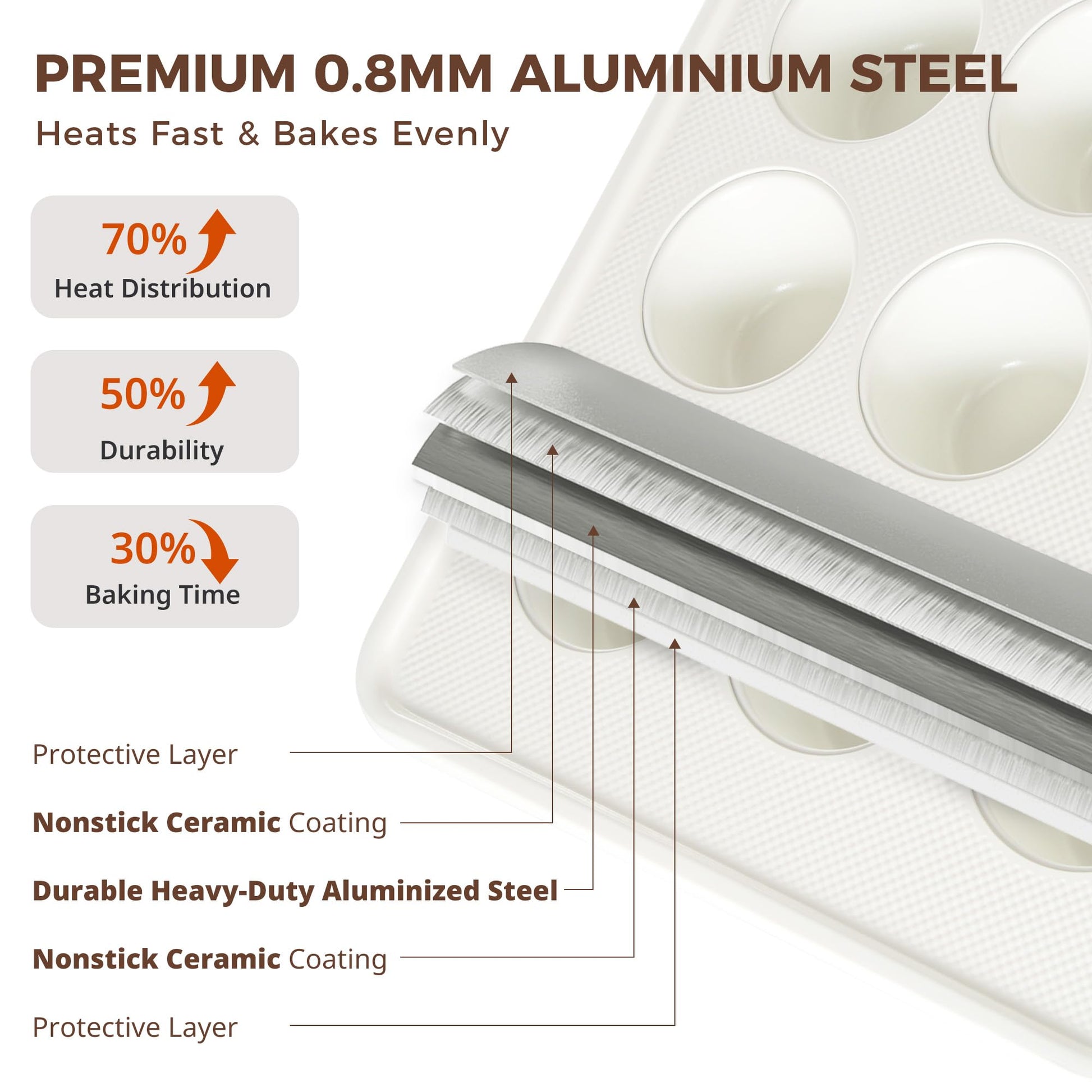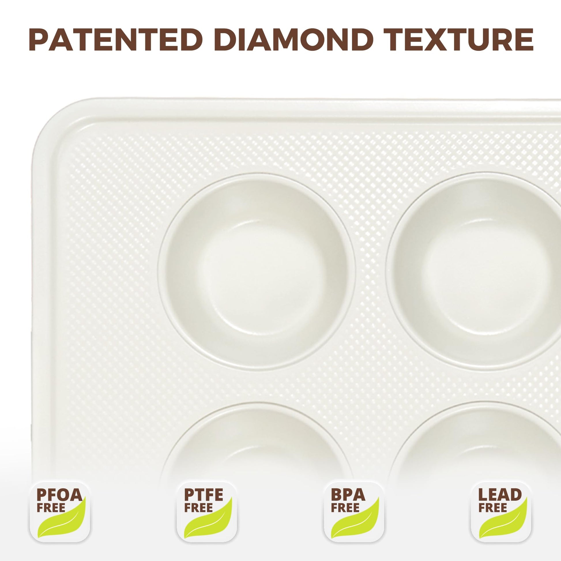 Each pan features a diamond-textured base that promotes more even heat flow and faster cooling, while also helping protect the surface from everyday scratches. Finished with a natural ceramic nonstick coating, these pans deliver easy release and simple cleanup without relying on PTFE, PFOA, PFAS, lead, or cadmium (as listed). Built on 0.8 mm heavy-duty aluminized steel, they heat quickly, resist warping, and stay stable up to 500°F for reliable baking session after session.