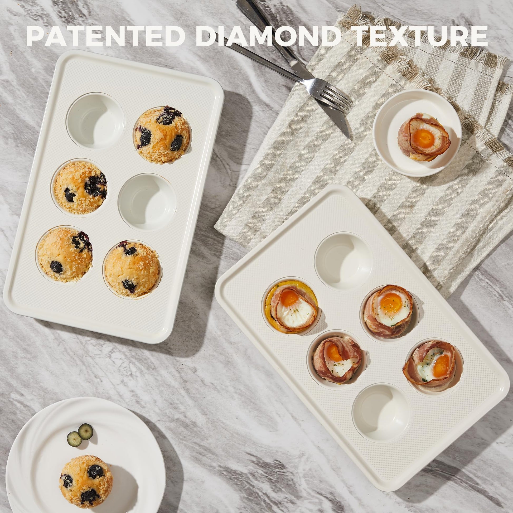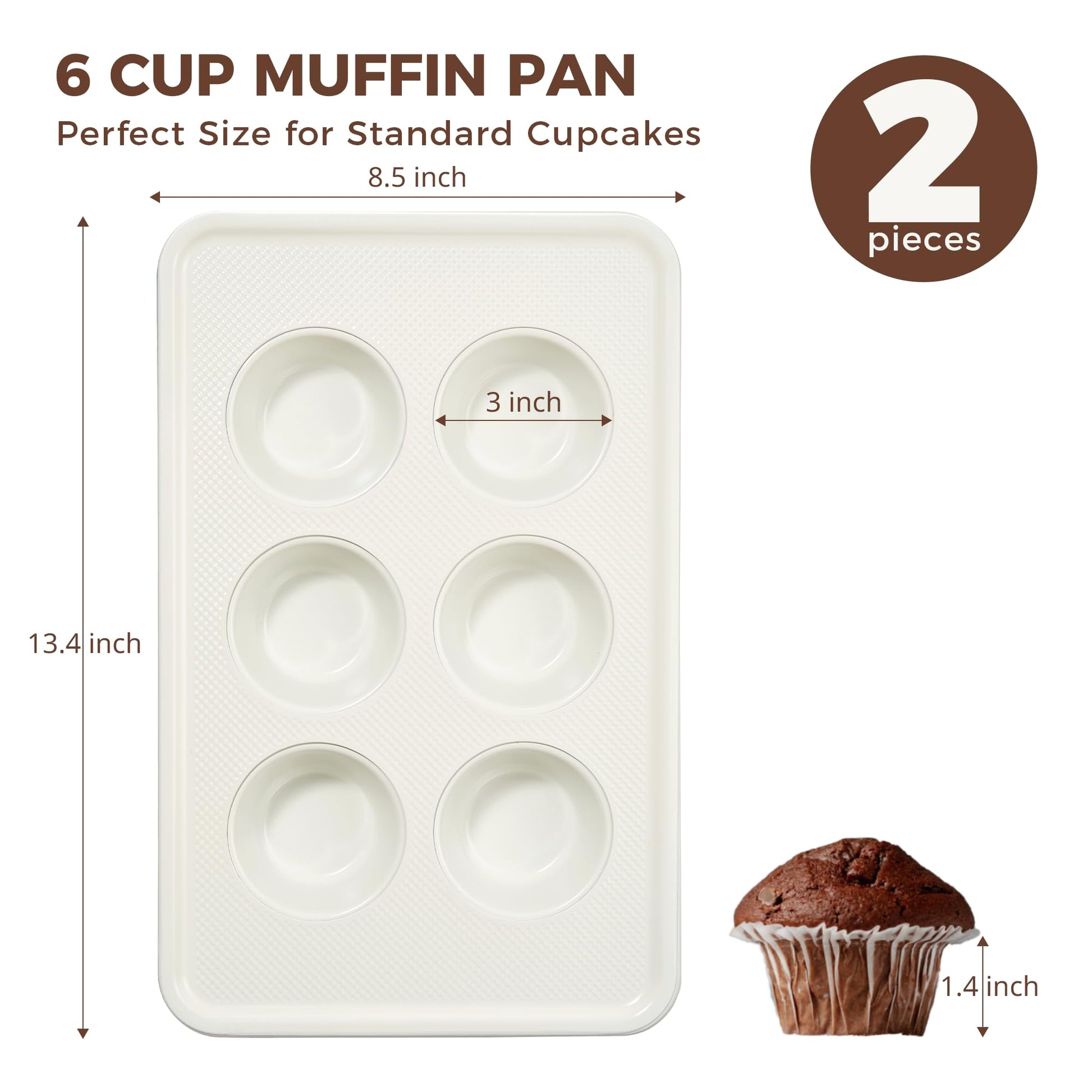 Bake small batches with better release and more consistent results. The Diamond Texture Ceramic Nonstick Muffin Pan 6-Cup (2-Pack) includes two pans with standard-size cups—perfect for muffins, cupcakes, egg bites, and quick breakfast bakes. With two 6-cup pans, you can bake 12 muffins at once or run two different flavors side by side without crowding your oven.