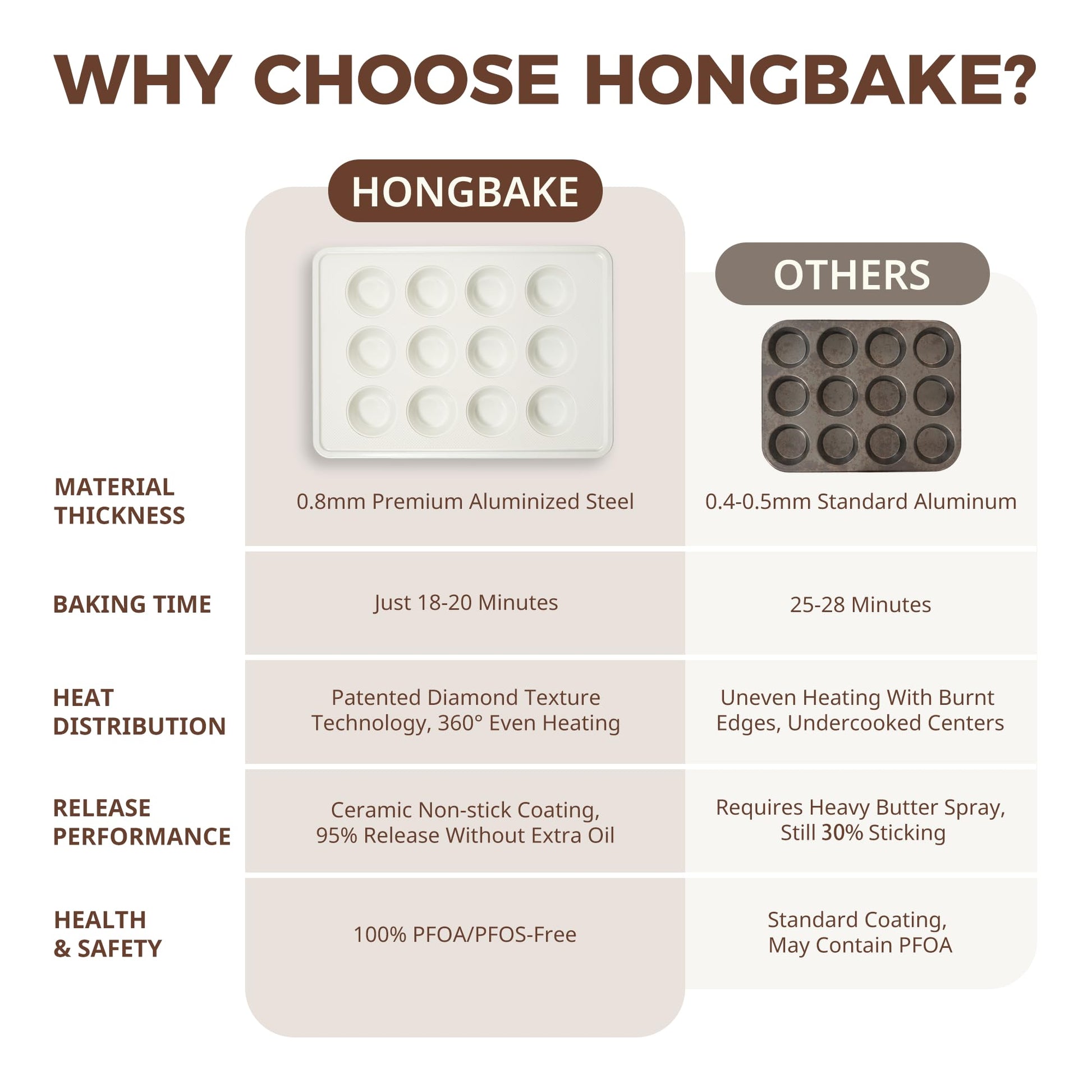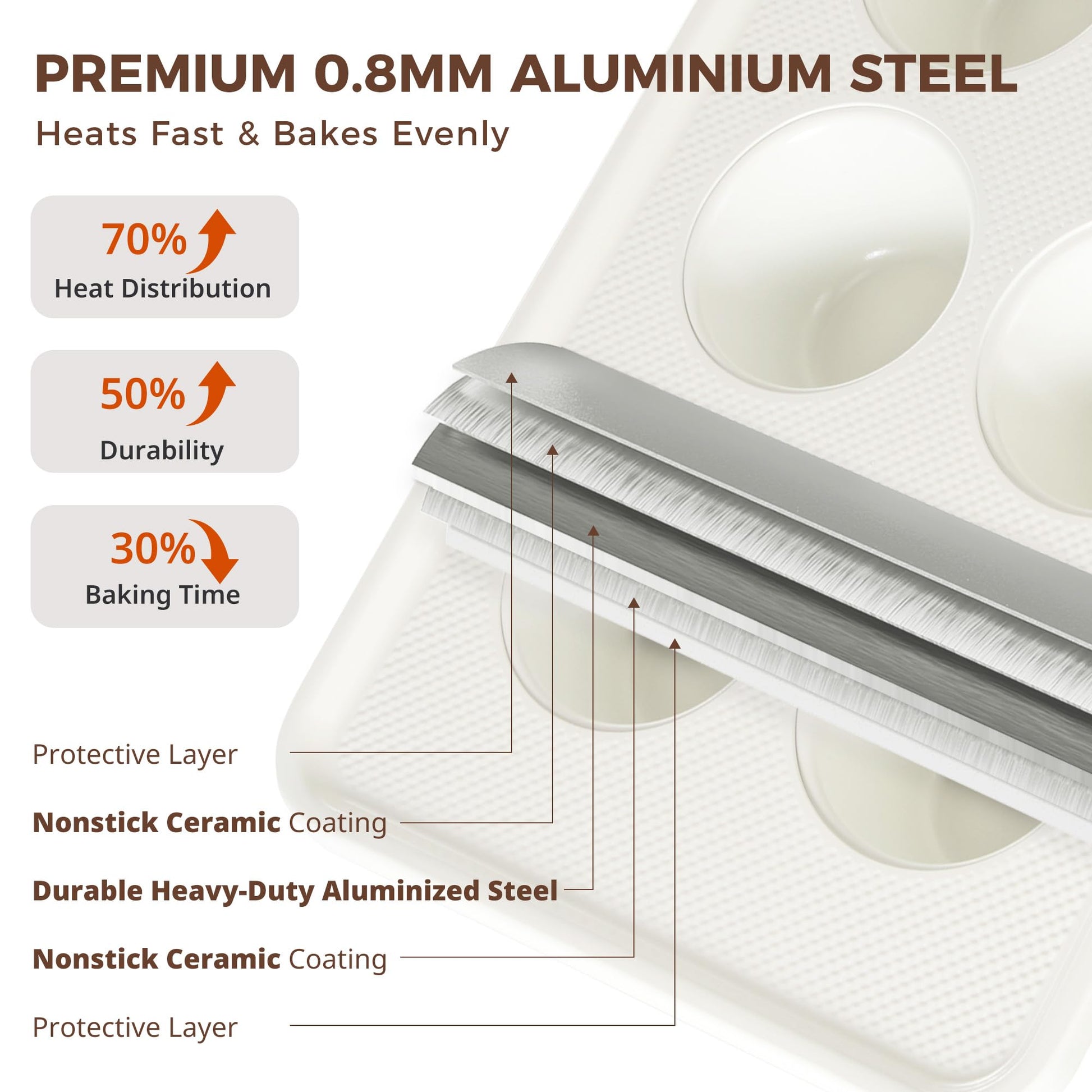Each pan features a diamond-textured base that helps promote more even heat flow and faster cooling, while also helping protect the surface from everyday scratches. Finished with a natural ceramic nonstick coating, it delivers easy release and simple cleanup without relying on PTFE, PFOA, PFAS, lead, or cadmium (as listed). Built on 0.8 mm heavy-duty aluminized steel, these pans heat quickly, resist warping, and stay stable up to 500°F for reliable baking session after session.