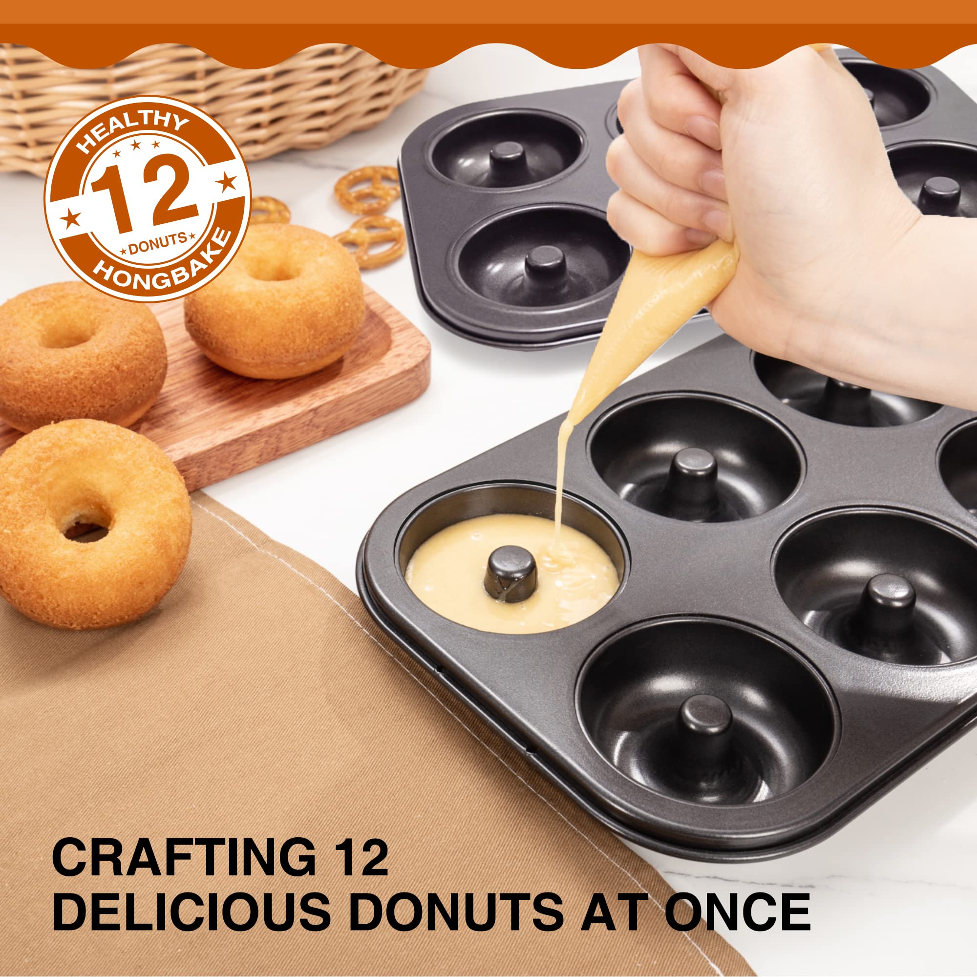 You can make healthier snacks for yourself or your families every day because these donuts are baked and not fried. Our non-stick donut baking pan set includes two 6-cavity donut pans, so you can bake a dozen donuts effortlessly at once. After decorating with your favorite icing, 12 low-fat and low-oil desserts are finished!