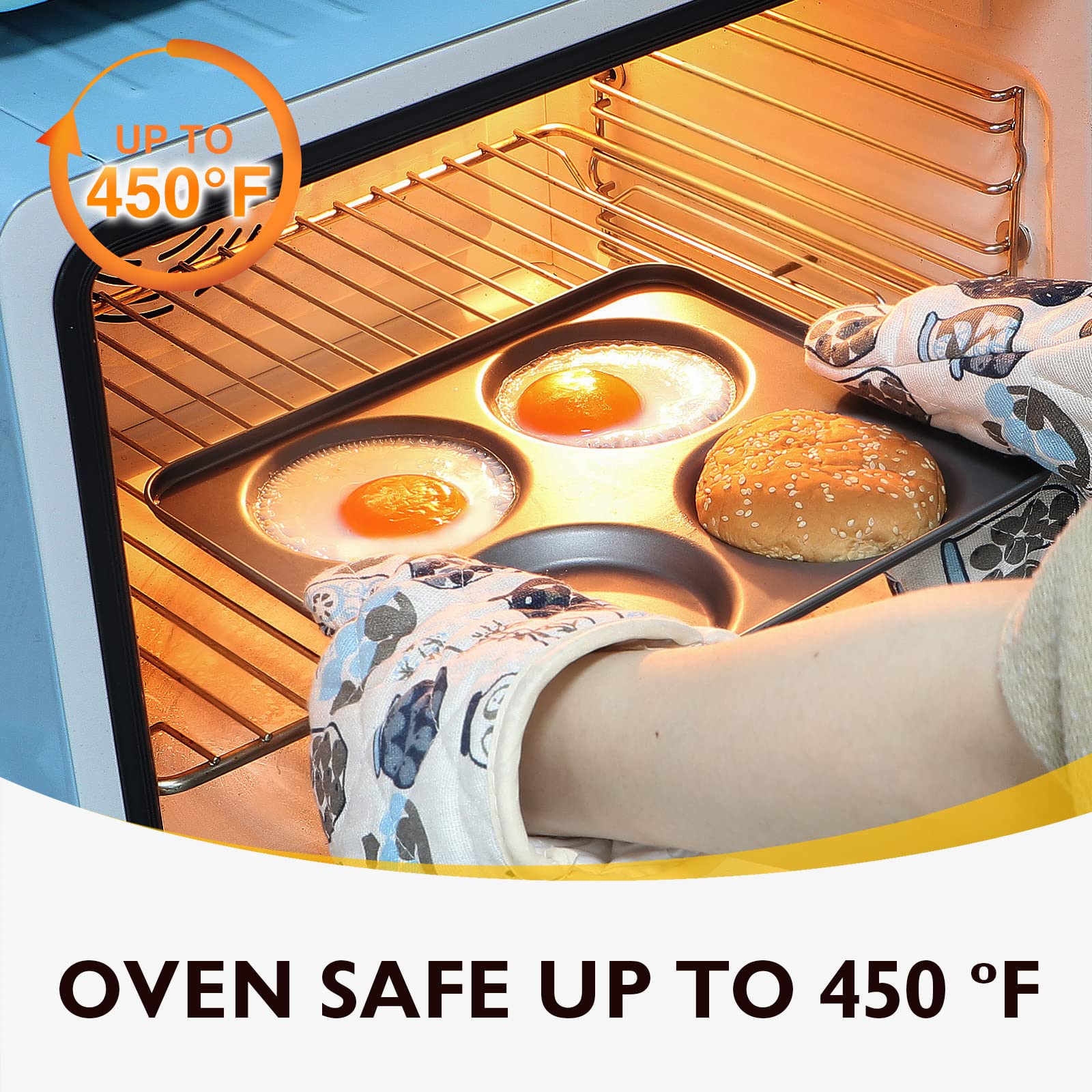 It's perfect for eggs, hamburgers, Yorkshire puddings, fruit tarts, whoopie pies, muffins, and cookies in large quantities for upcoming parties. The long-lasting and non-stick surface will help food slide or pop out easily. Make 8 perfect portions at once with this 2-pack set!