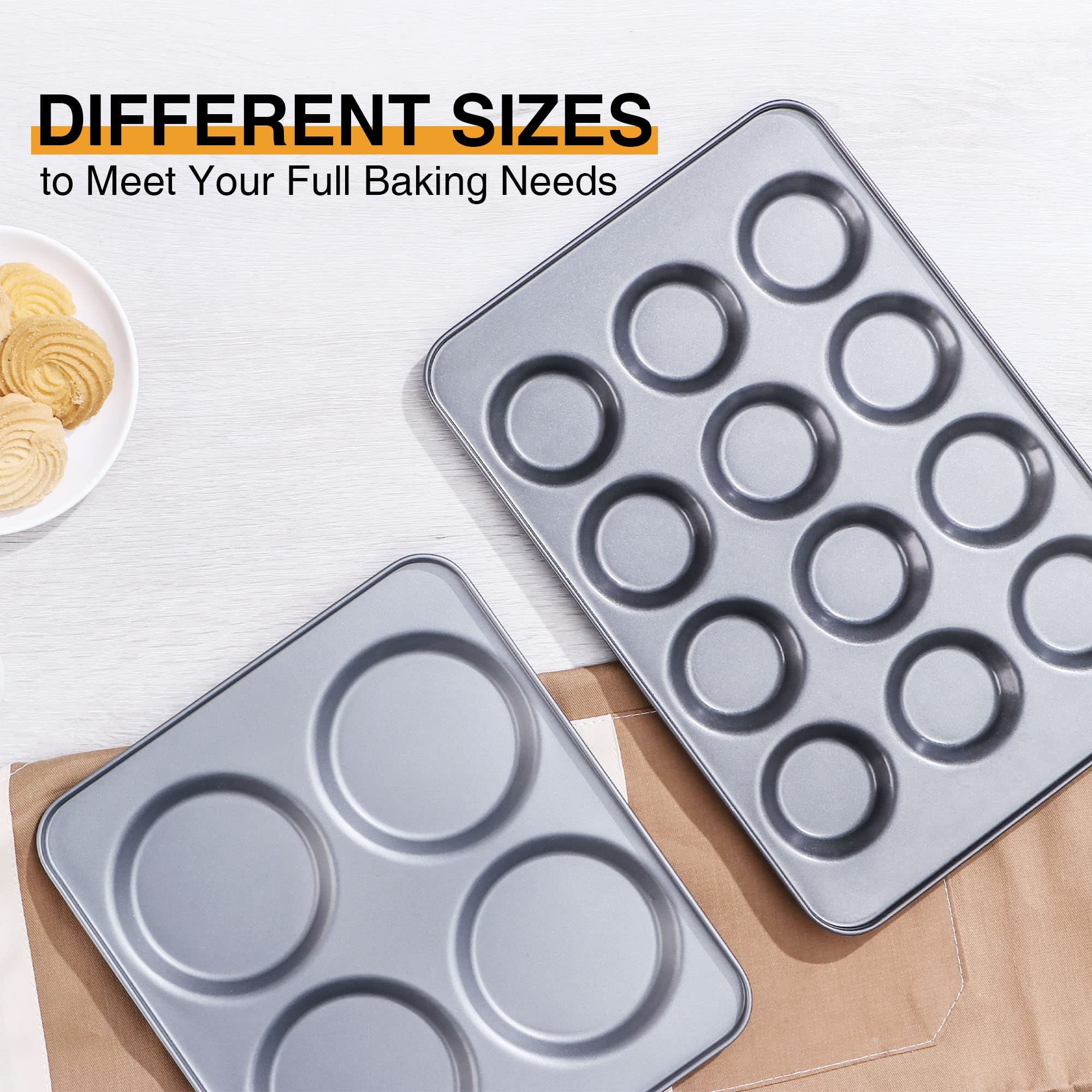 Each muffin top tin is 10" × 9" × 0.5", and each cavity is 4" in diameter. The non-stick muffin pan was made integrally, with no solder joints, which offers stronger construction and is less prone to rust. The widened handle design (1") increases contact area for better grip. The unique raised edge design prevents the liquid from flowing out or the cookies from slipping to the floor.