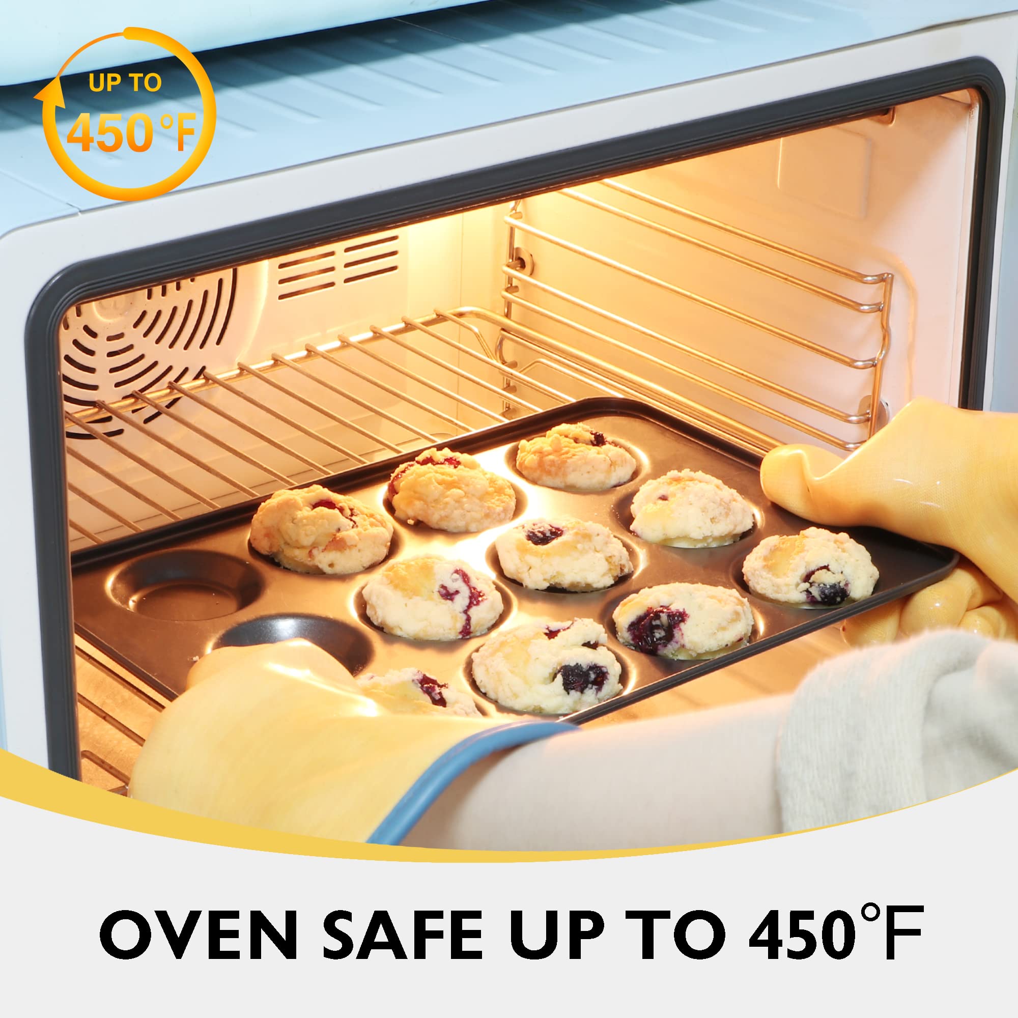 With 27% thicker carbon steel, these durable muffin top pans for baking are constructed from heavy-gauge carbon steel for stability, even heat distribution, and durability for years to come. Warranty against peeling off with heat-resistance temperature up to 450°F.
