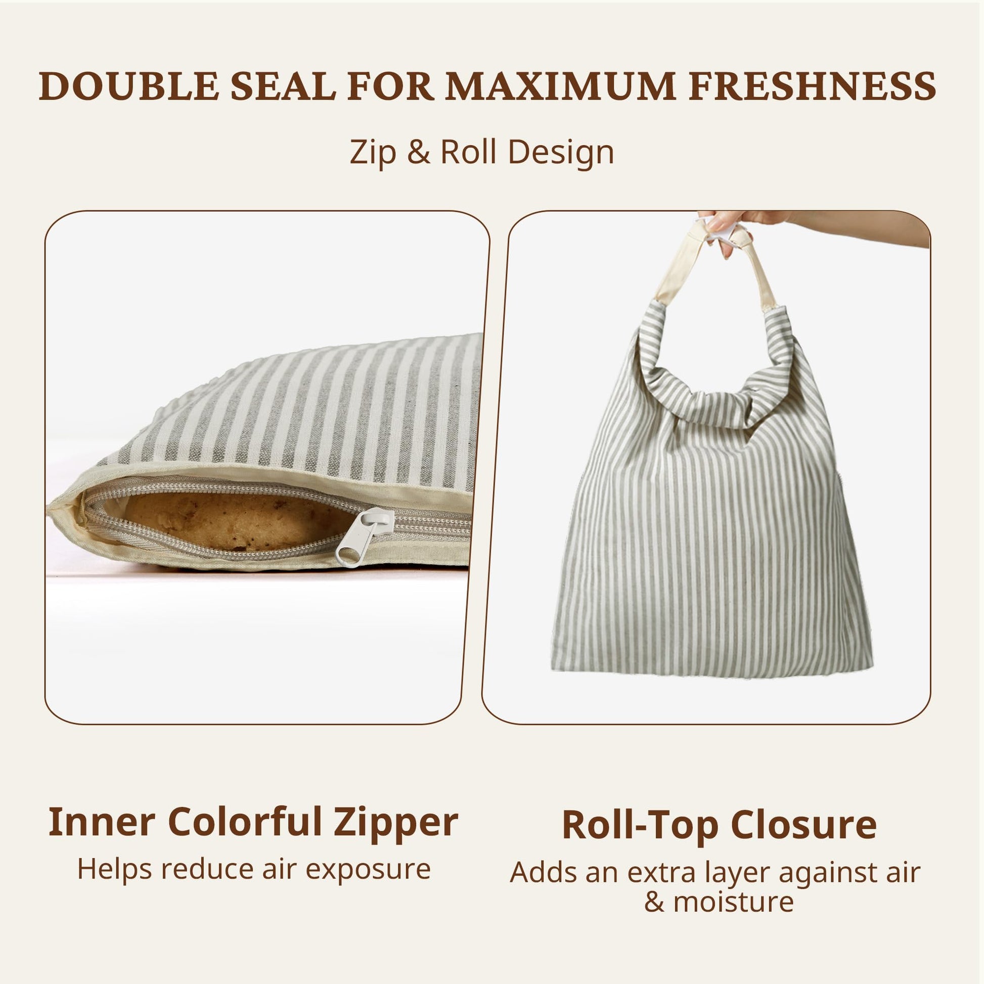 Each bag pairs a smooth, color-matched zipper with a roll-and-buckle style closure for extra security. Inside, an upgraded, odor-free beeswax coating helps maintain freshness for everyday countertop storage and works well for freezer storage too—reducing the chance of freezer burn and helping preserve flavor.